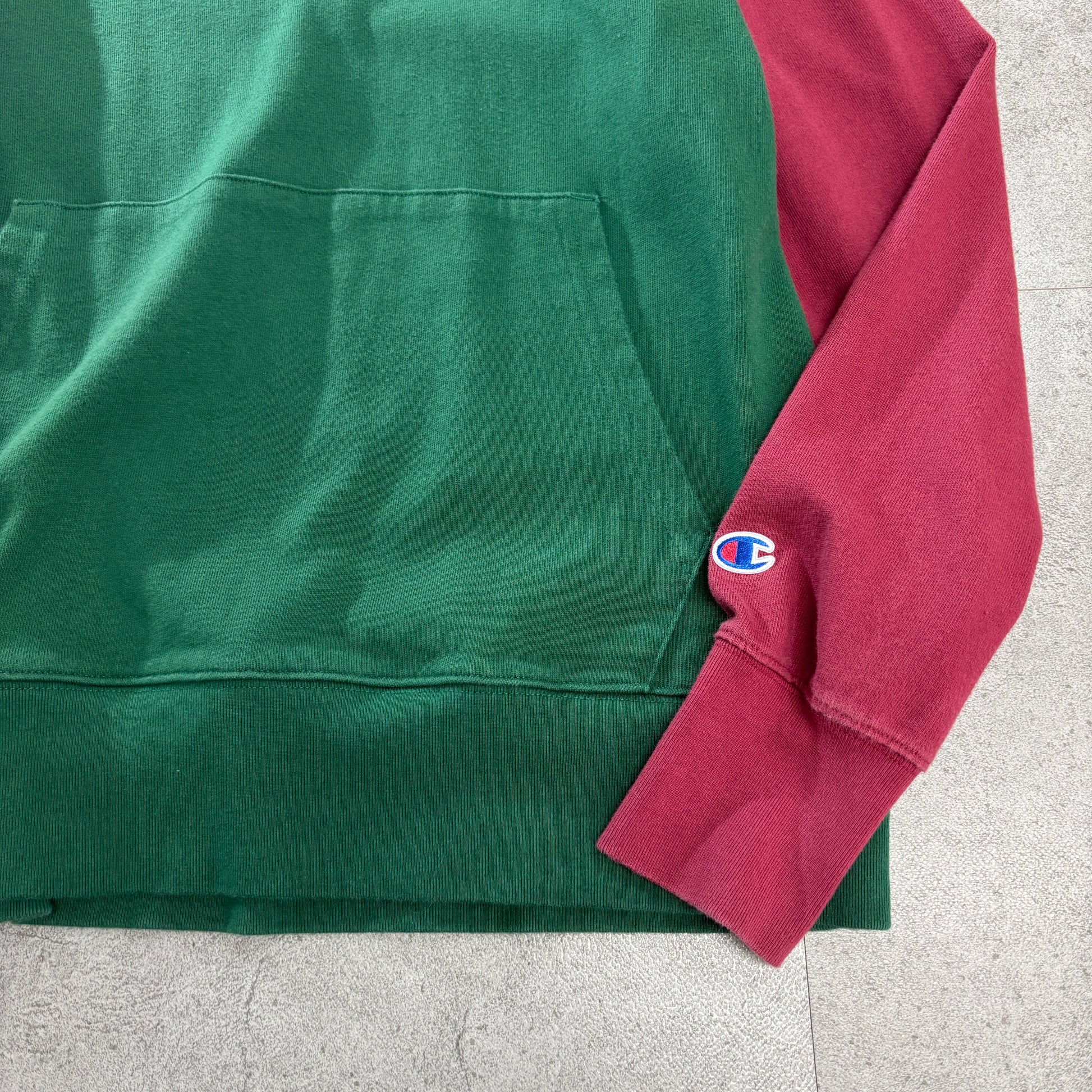 Champion ラガーシャツ風 スウェット プルオーバー M/カラーブロック(グリーン×オレンジ×バーガンディ)白襟 刺繍ロゴ カンガルーポケット
