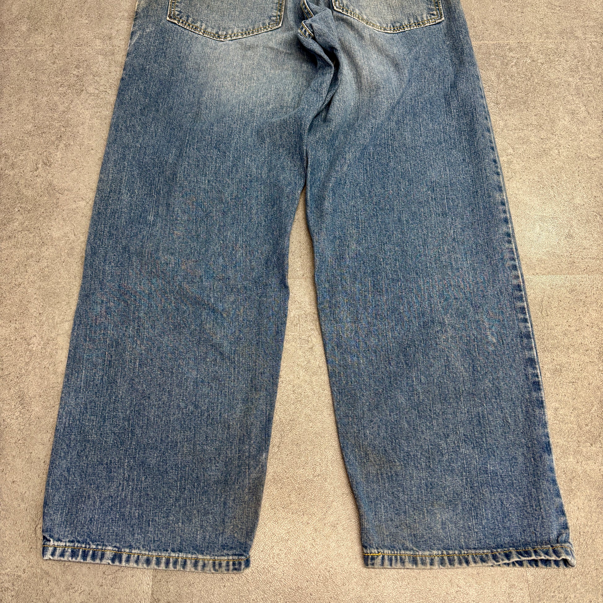 今回入荷の1本はライトインディゴの色落ちに加え、フロントやモモにアタリ・フェード感がしっかり出た雰囲気系。100%コットン特有のハリ感と縦落ちがヴィンテージライクで、太めのシルエットながら野暮ったくならずストリートやY2Kコーデの主役に最適です。