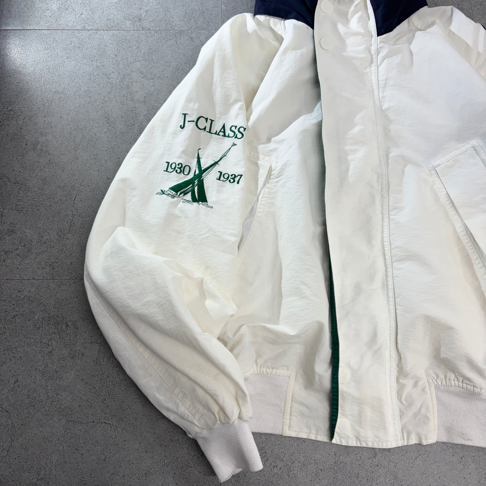 ・仕様:フロントジップ+比翼、袖“NAUTICA CHALLENGE”プリント、左袖J-CLASS刺繍、ハイネック、リブ袖口
