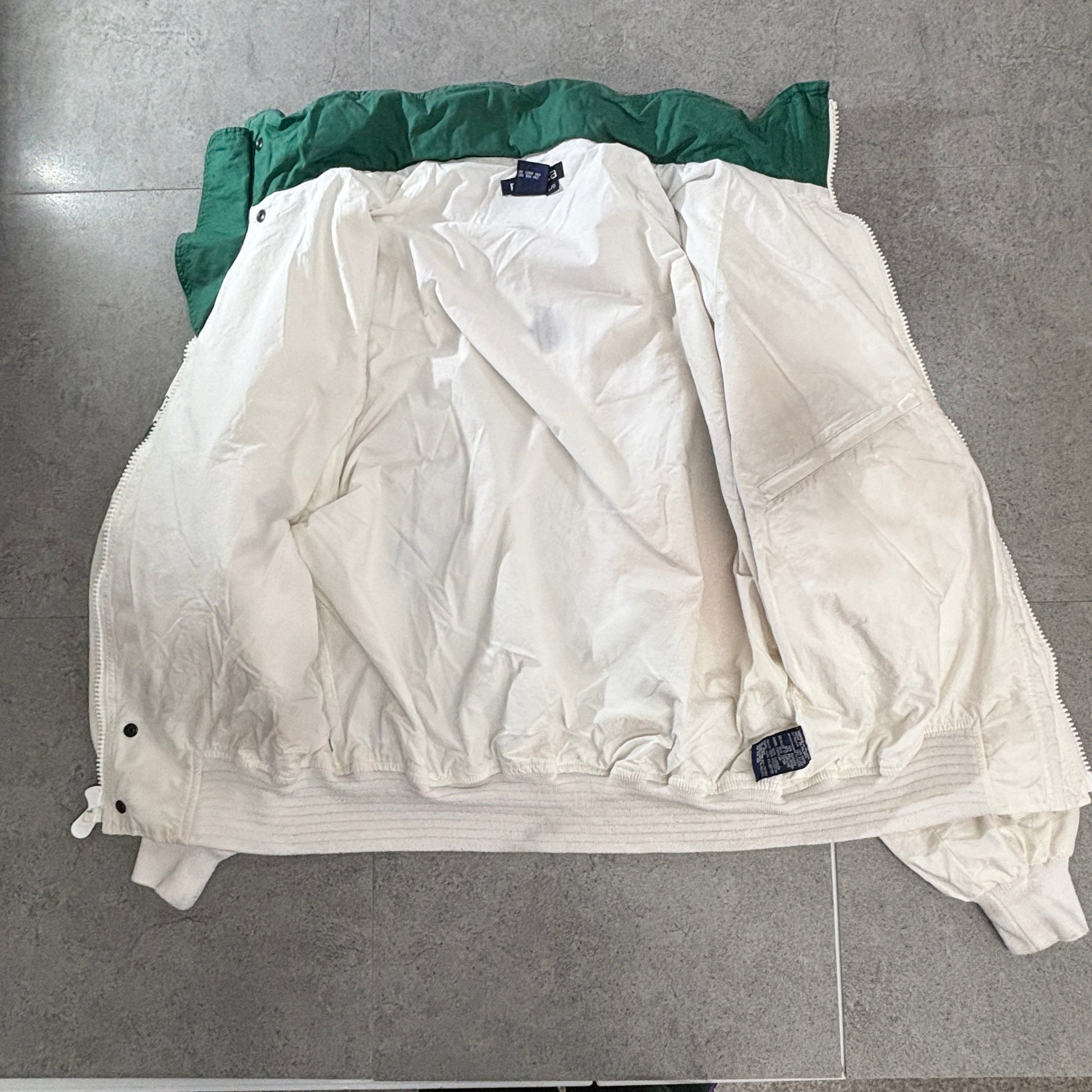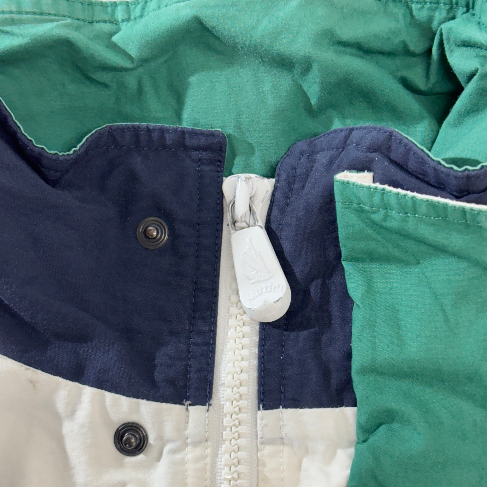 90年代ストリートを象徴する“NAUTICA CHALLENGE”。袖の縦ロゴとJ-CLASS刺繍が映える王道デザインです。コットン70%×ナイロン30%のセーリング素材で、比翼ジップ&ハイネック、リブ袖口で防風性も◎。クリーンなホワイトにネイビー×グリーンの配色が爽やか。デニムやチノに羽織るだけで90sムードを作れます。