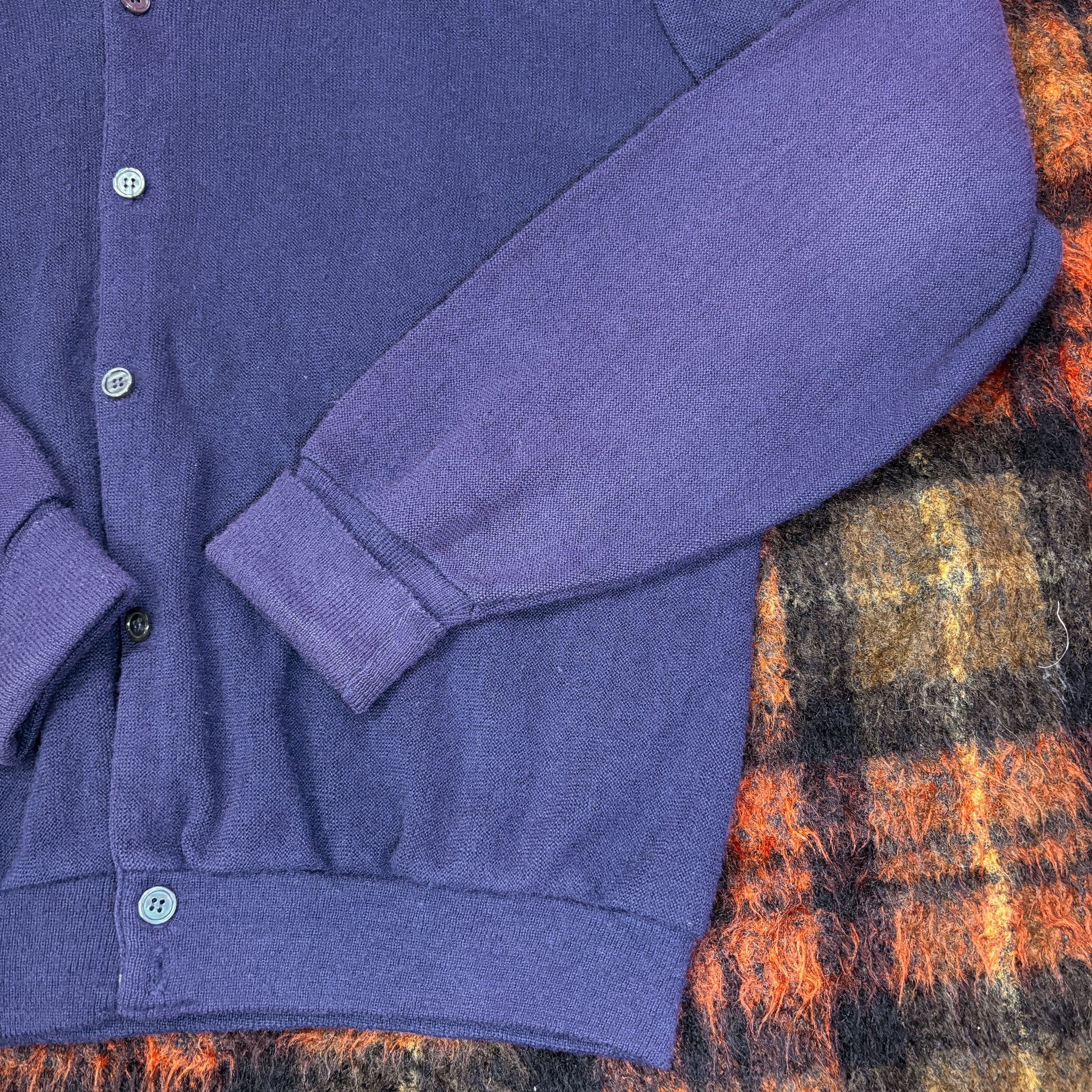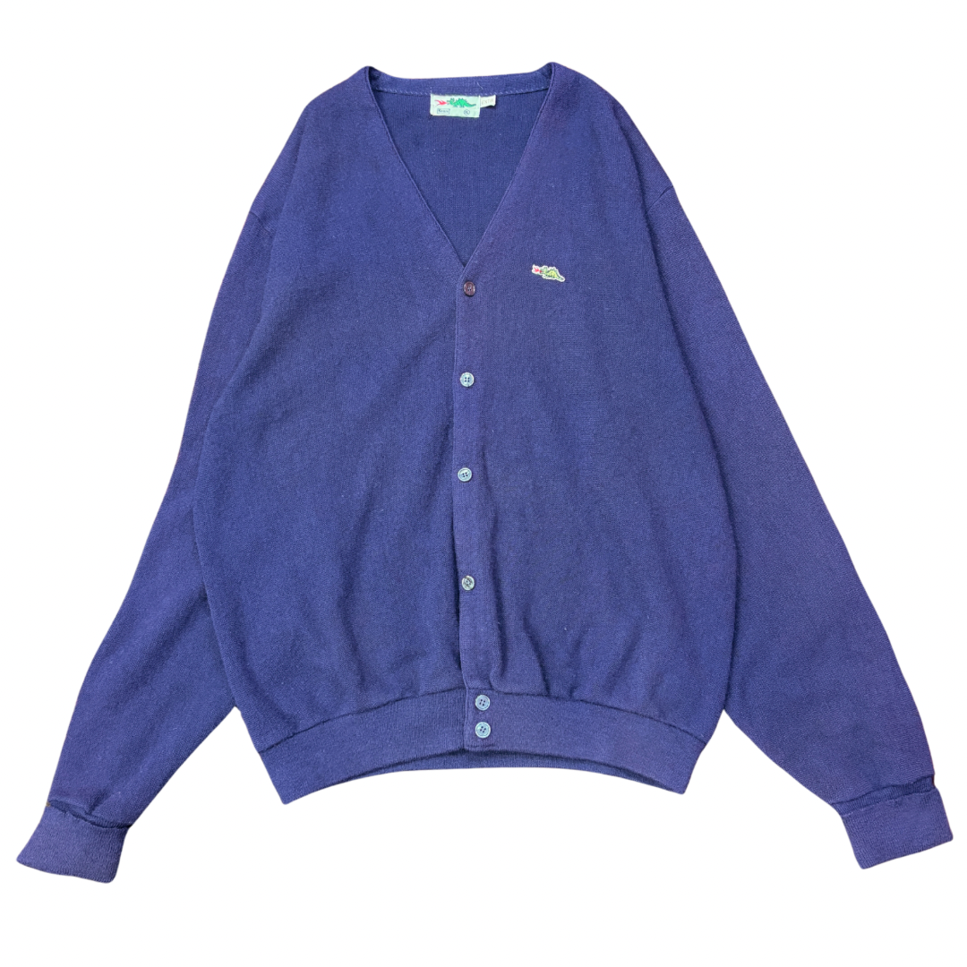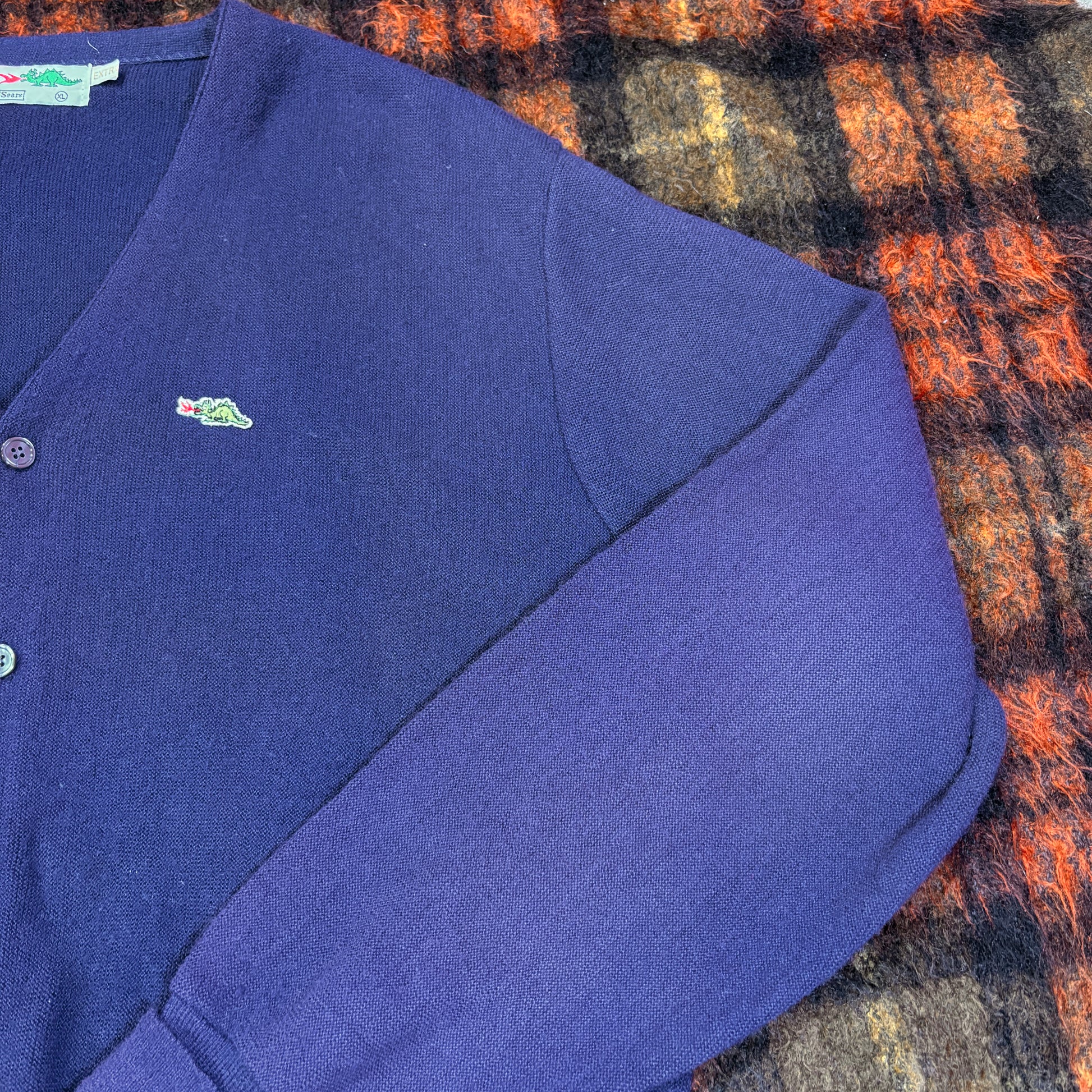 レトロなファイヤーブレス・ドラゴンの刺繍が胸元に入った、Sears製のUSAヴィンテージカーディガン。珍しい“ドラゴンタグ”に加え、深みのあるパープルカラーとマルチカラーのボタンが絶妙なアクセント。