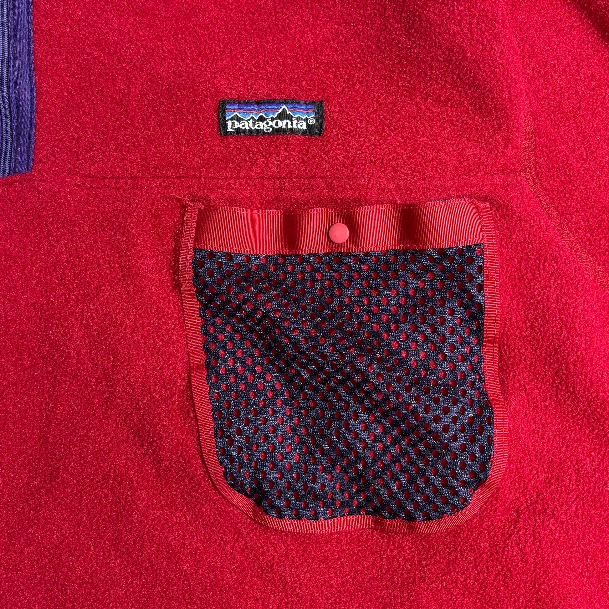 【90s Patagonia】USA製 Capilene® フリースプルオーバー レッド×パープル ハーフジップ メッシュポケット付き パタゴニア キャプリーン ヴィンテージ