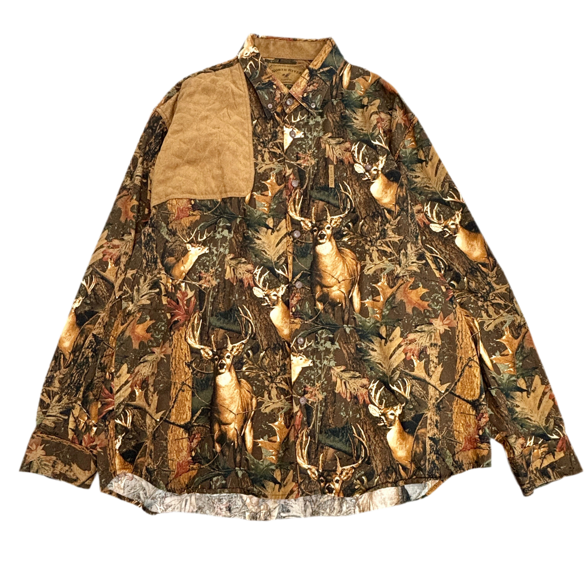 鹿や森の風景が大胆にプリントされたハンティングスタイルで、90sアウトドアブームを彷彿とさせる雰囲気があります。