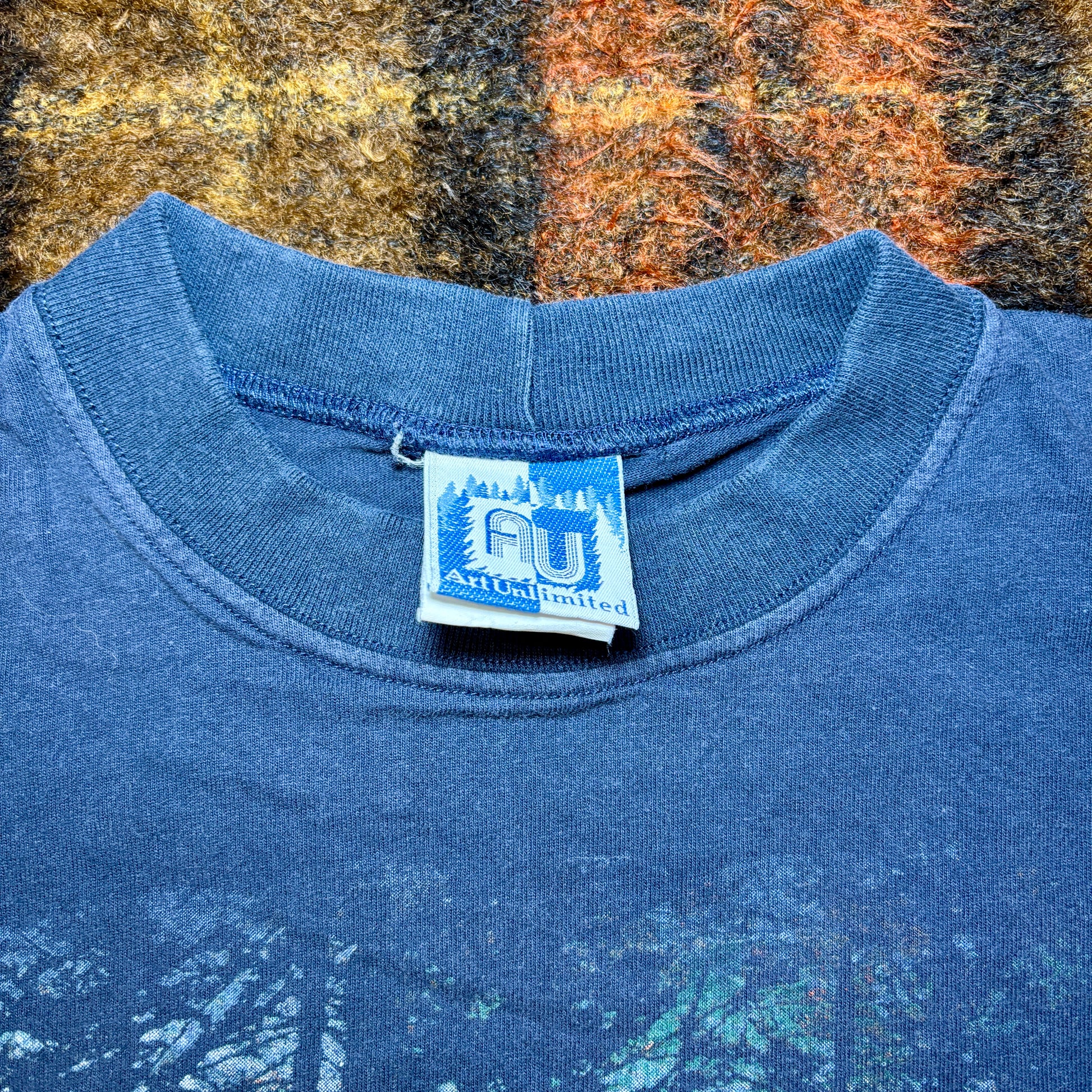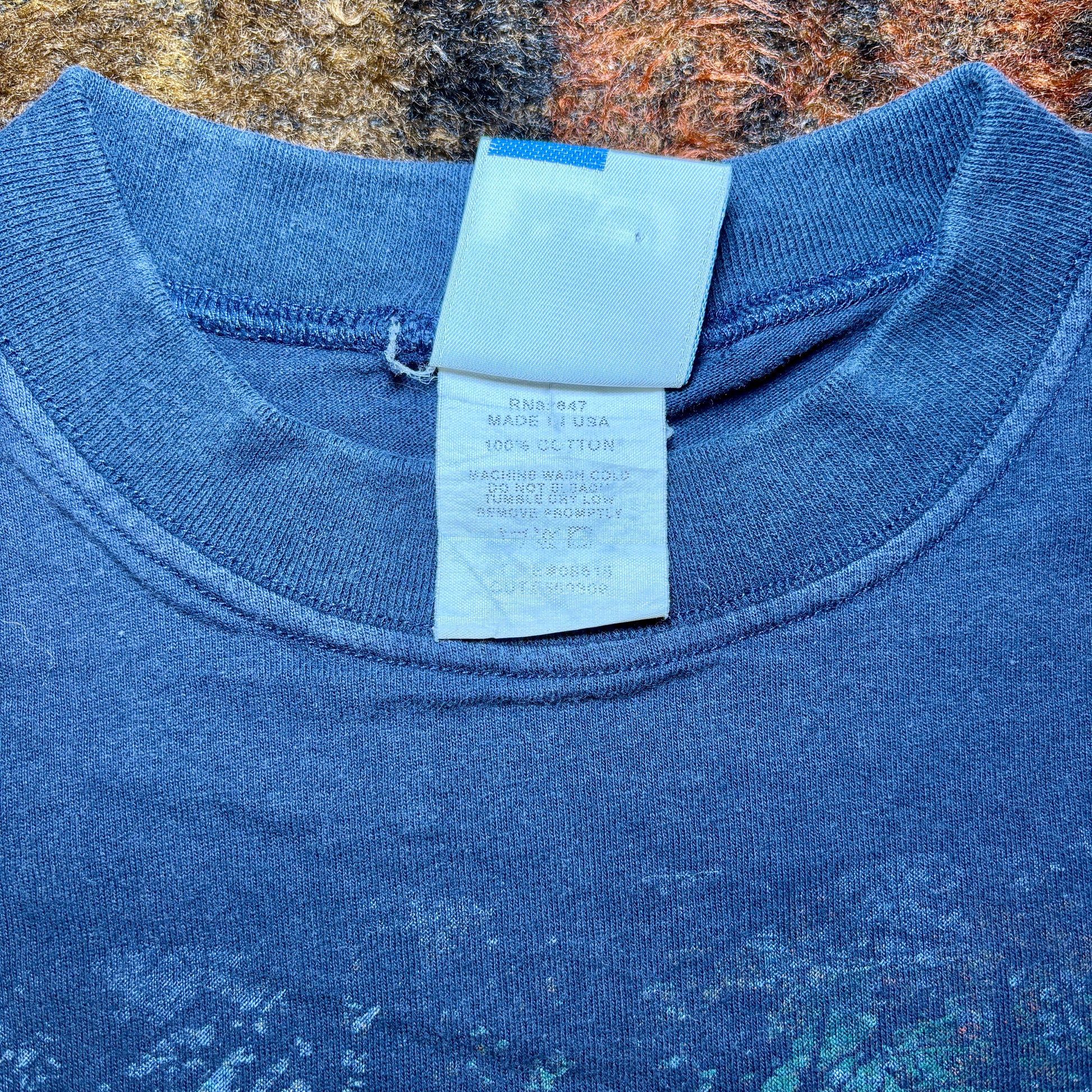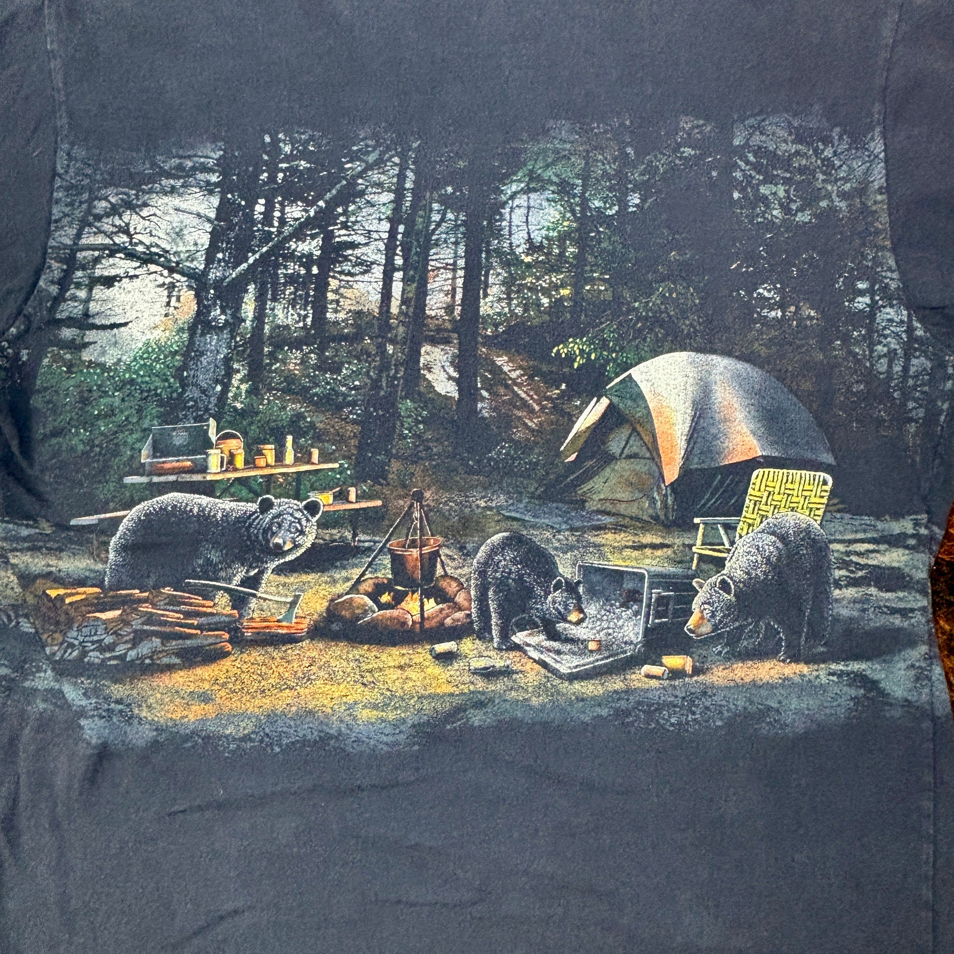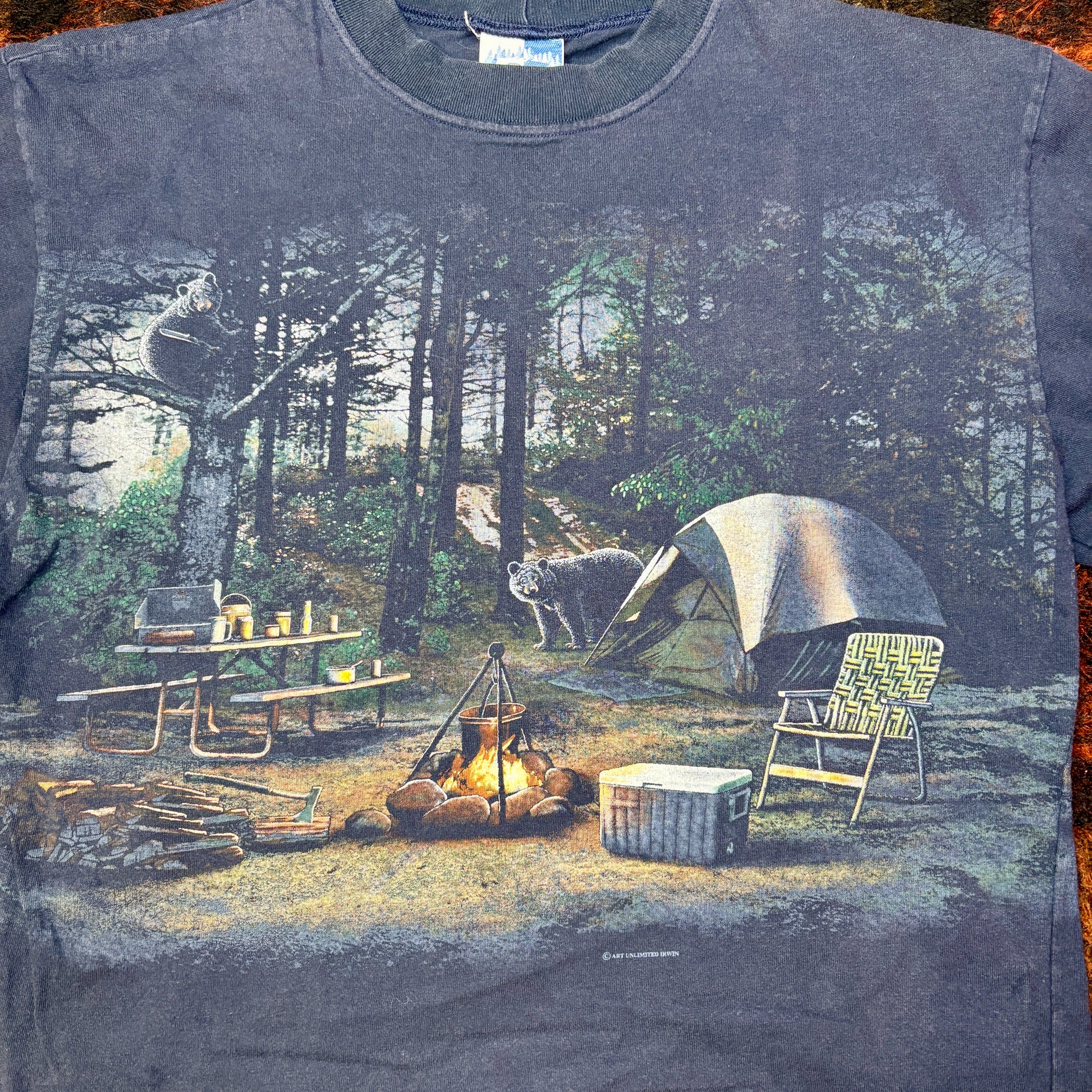 森の中のキャンプシーンをフルプリントしたグラフィックT。静かな焚き火、テント、チェア…アウトドア好きの心に刺さるリアルな描写で、自然派ファッションにもマッチ。味わいある褪せ感もGOOD。