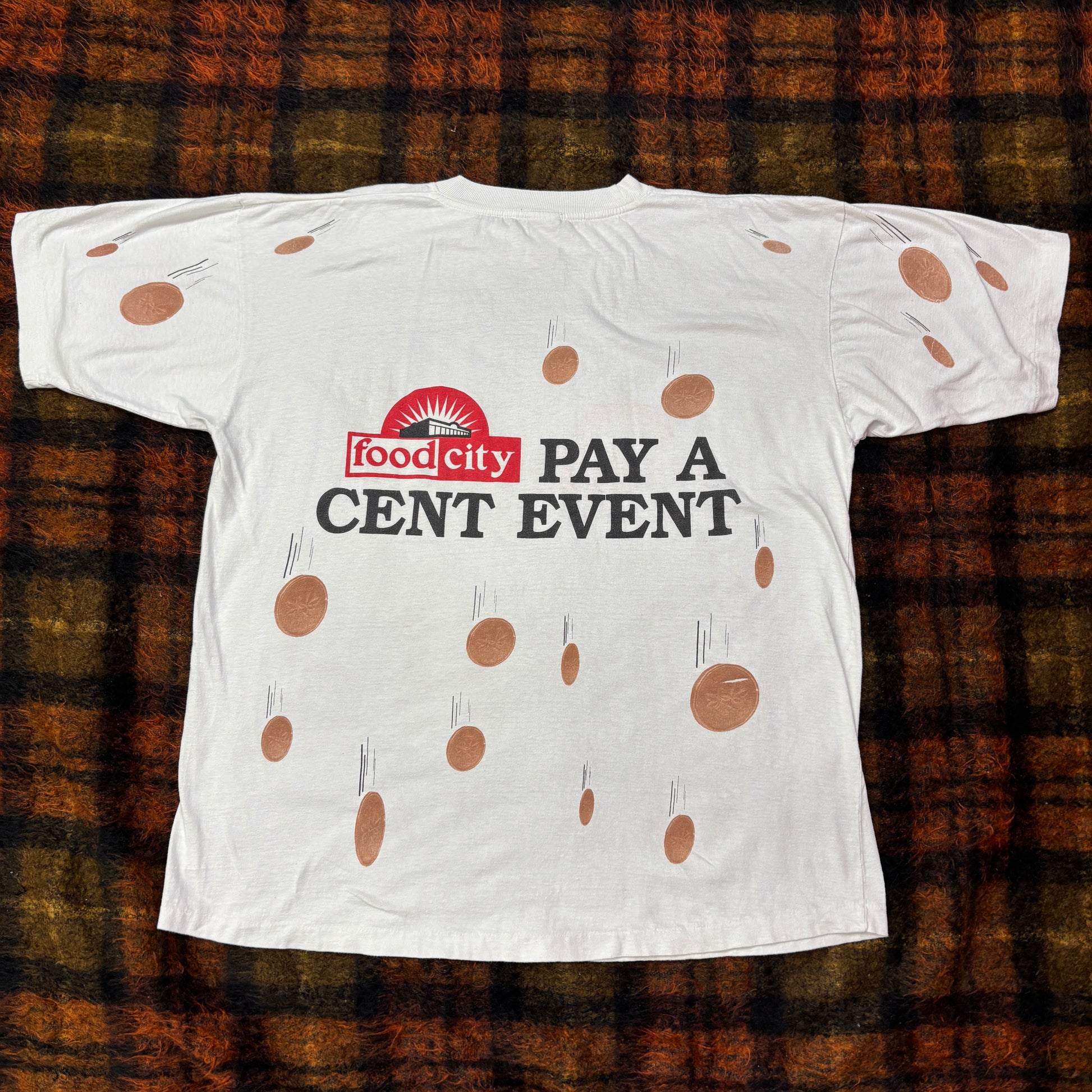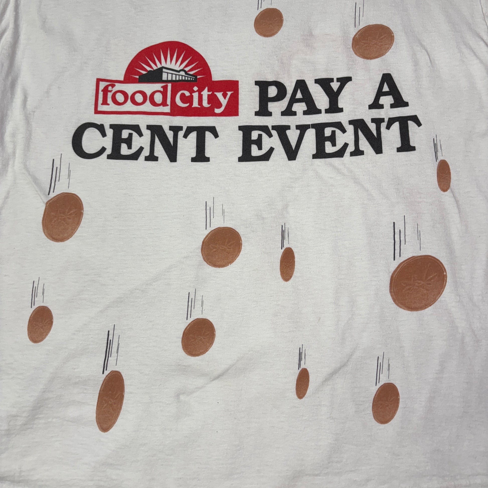 【ヴィンテージ風】Food City “Pay A Cent Event” 両面プリントTシャツ/ユニークペニーデザイン/USAカルチャー系・古着スタイルに◎