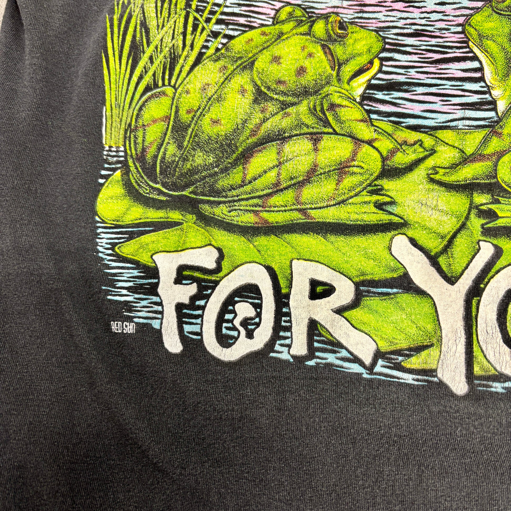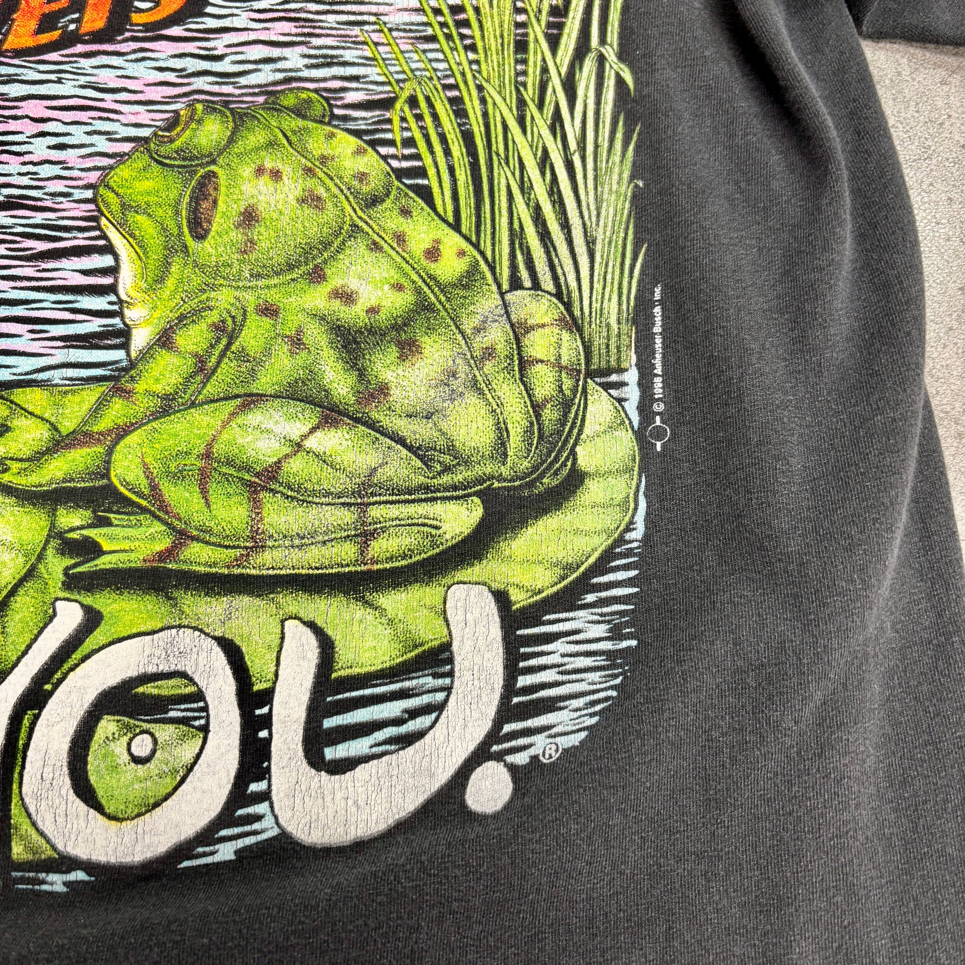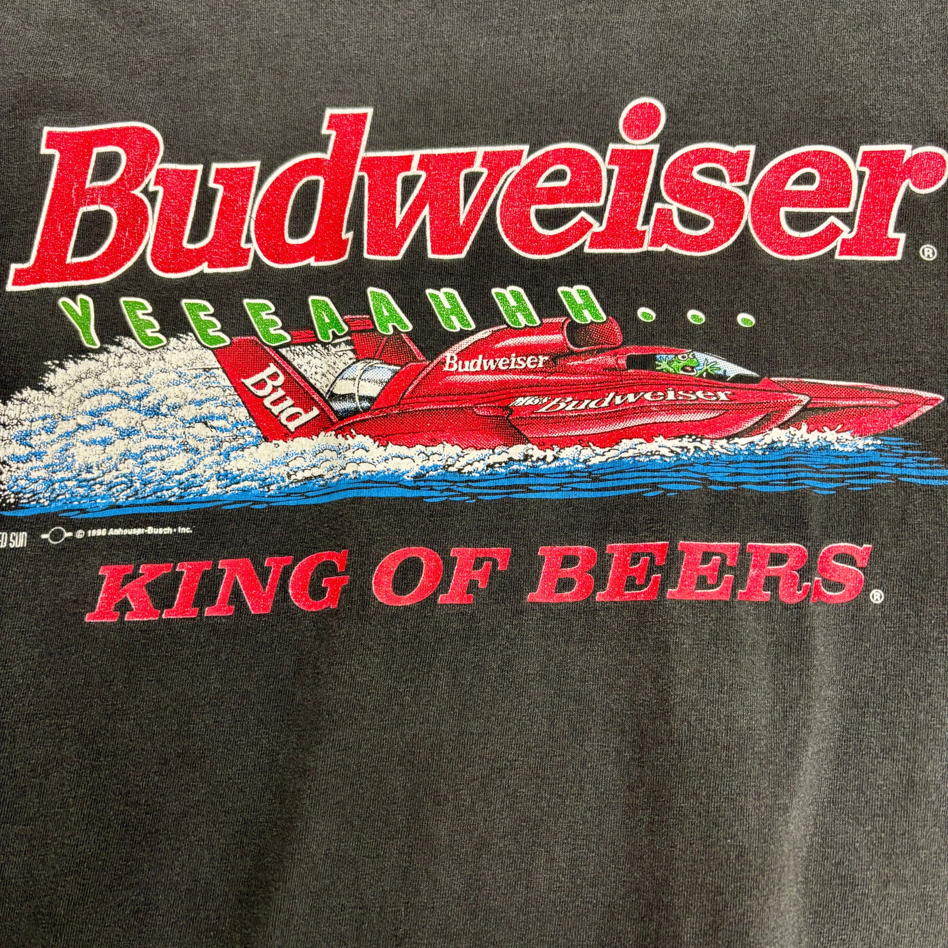 1998年コピーライト入りの、Budweiser(バドワイザー)Tシャツ。両面フルプリント仕様で、バックには池の上にたたずむ2匹のカエルが「Bud」「Weis」「Er」と叫ぶ、名作CMの名シーンを再現。フロントにはスピードボートの迫力あるプリントで、インパクト抜群。