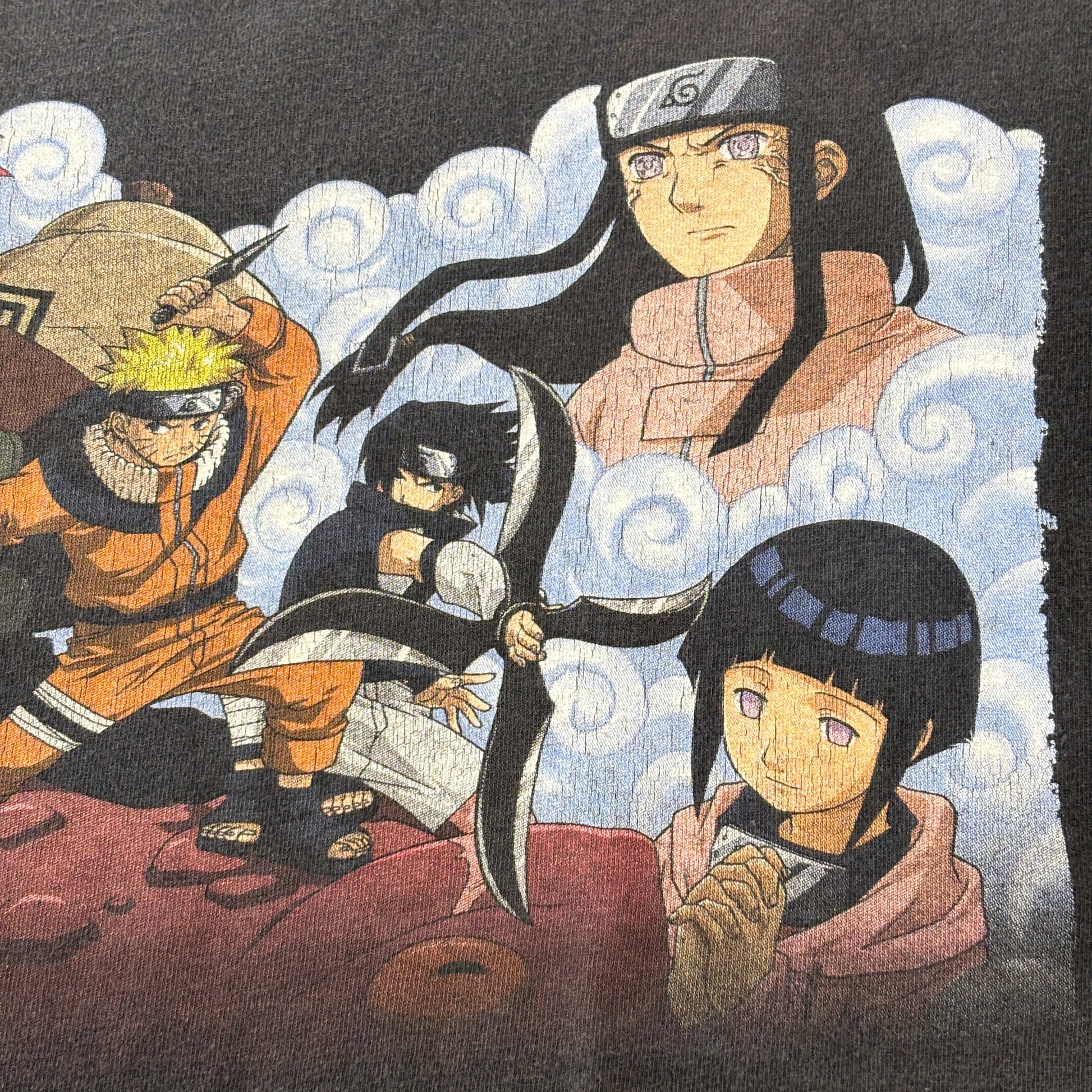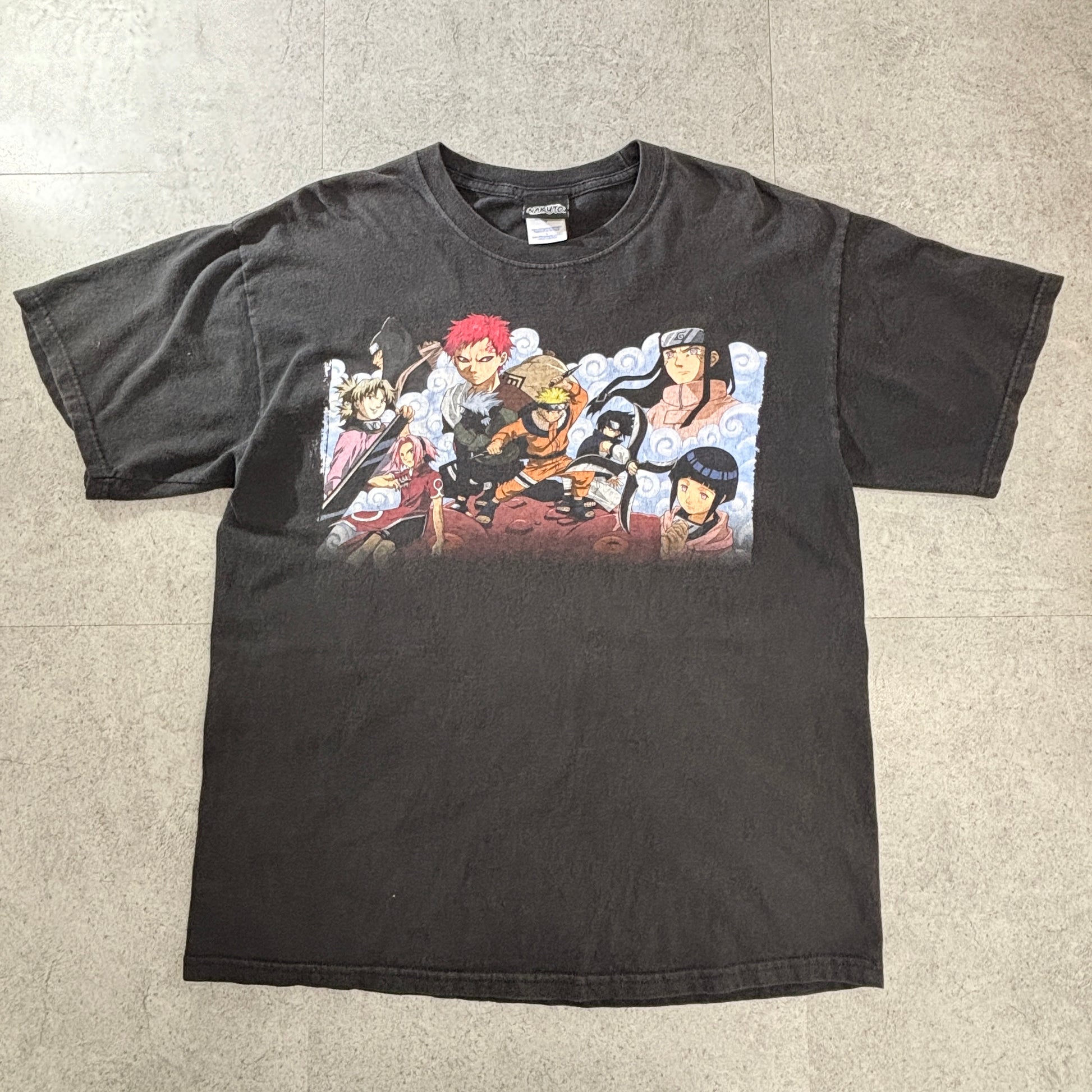 ナルト、サクラ、サスケ、我愛羅、ヒナタ、ネジなど主要キャラが集結した迫力ある集合デザインで、アニメファンから古着好きまで幅広く人気の高い一枚です。