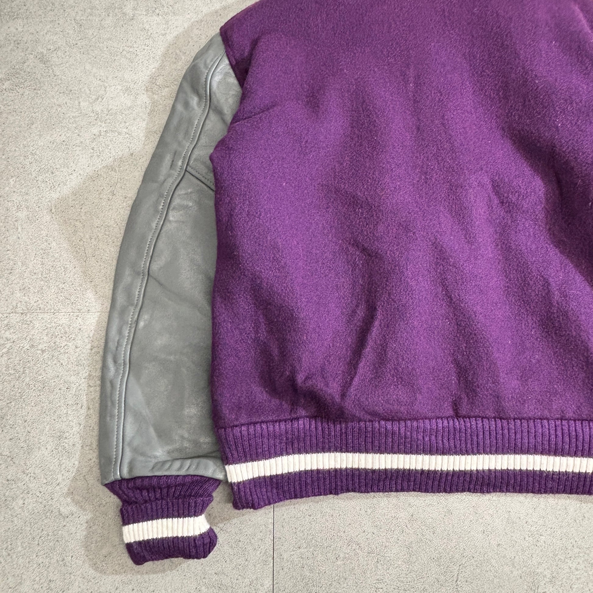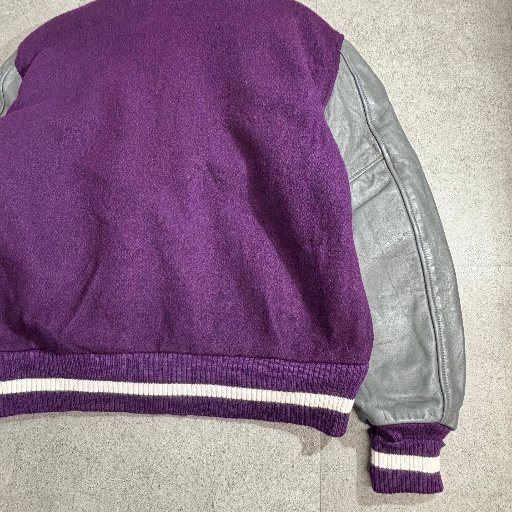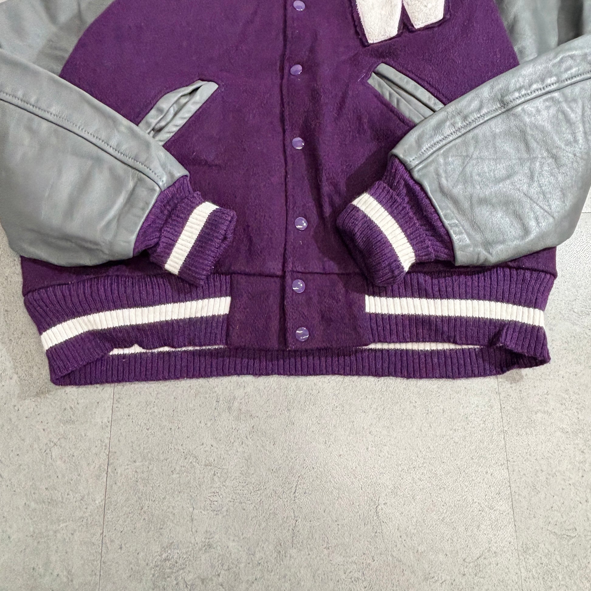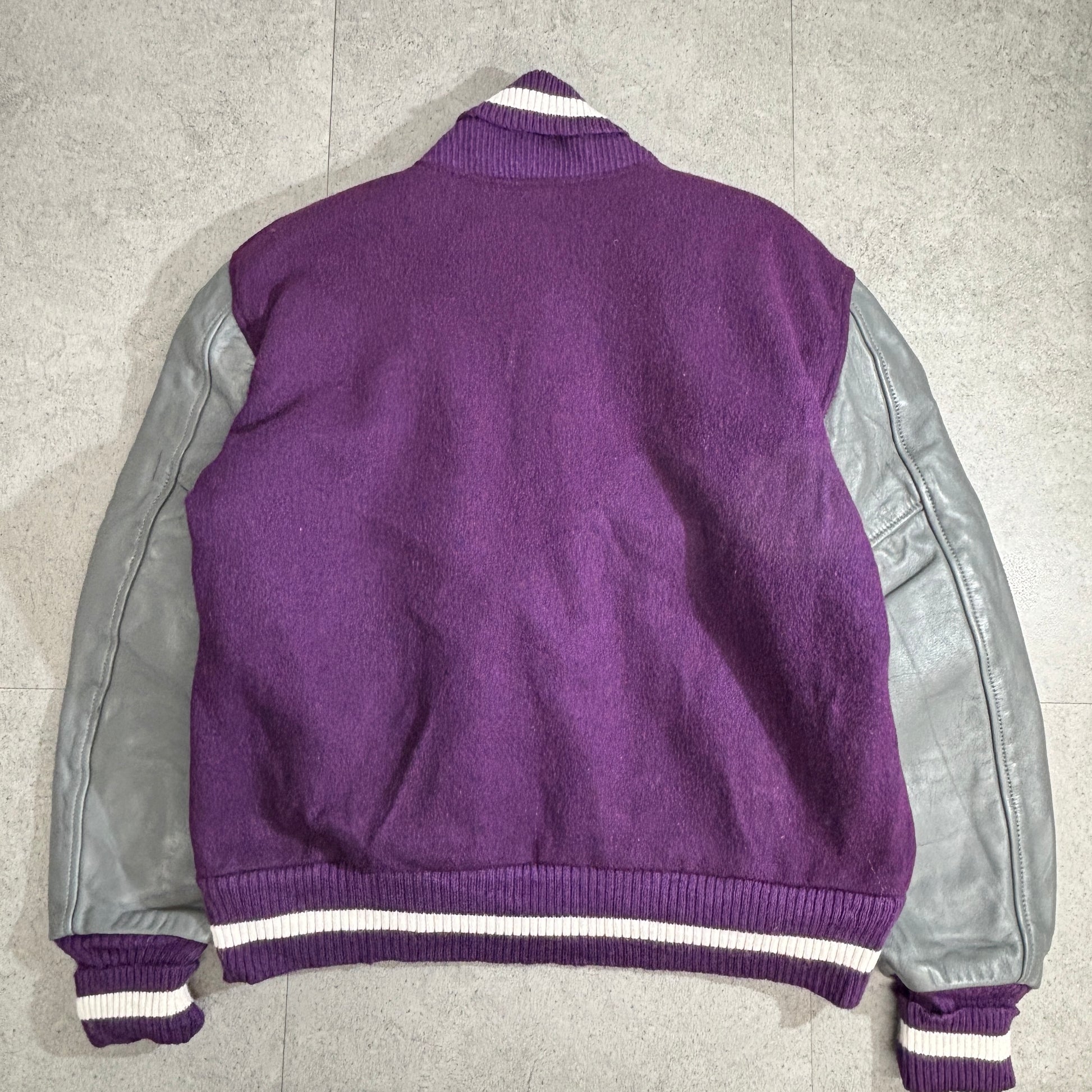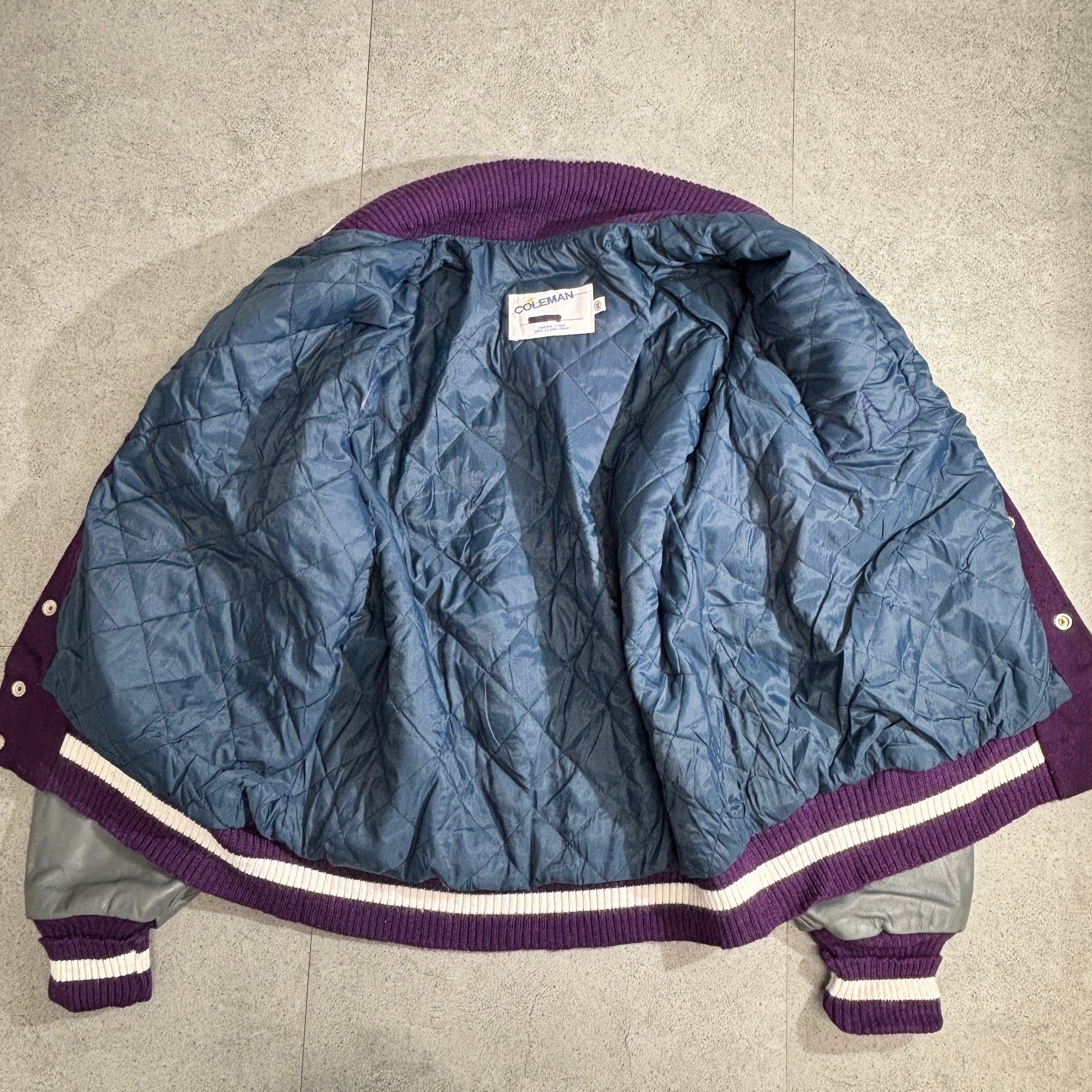 USA製 80s–90s COLEMAN レターマンジャケット 46|パープル×グレー 本革スリーブ|Wワッペン スタジャン