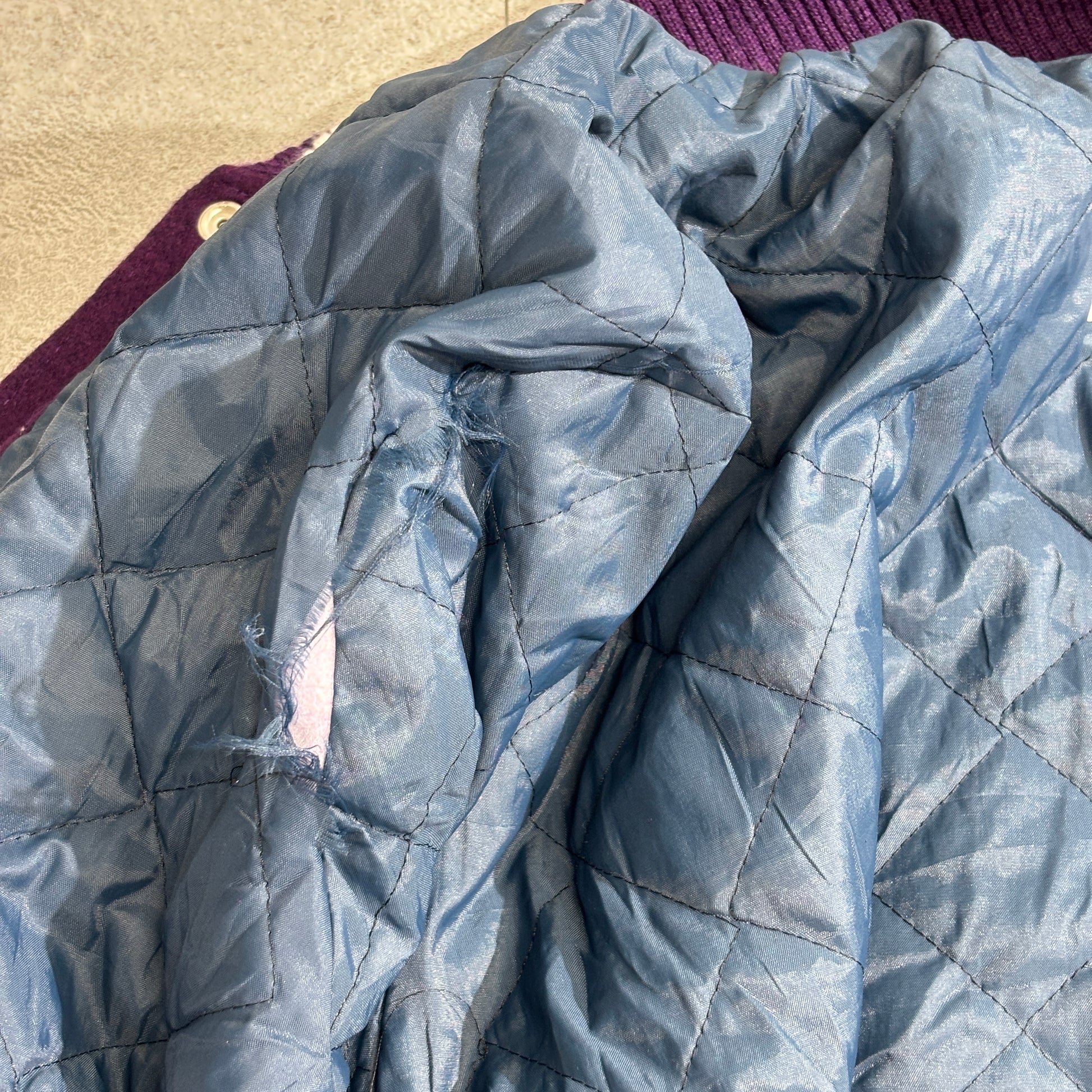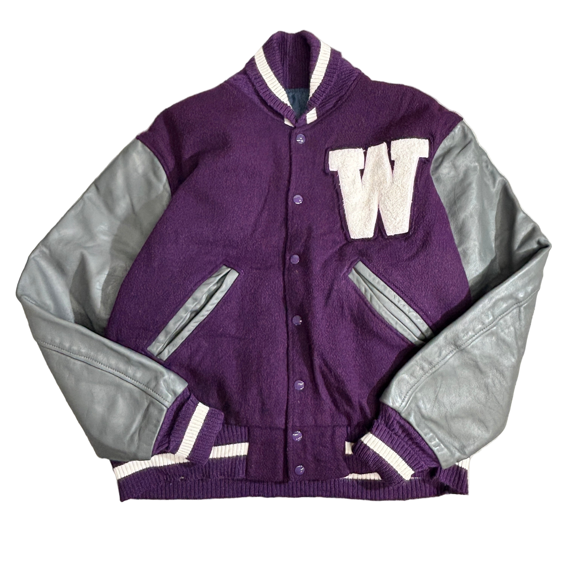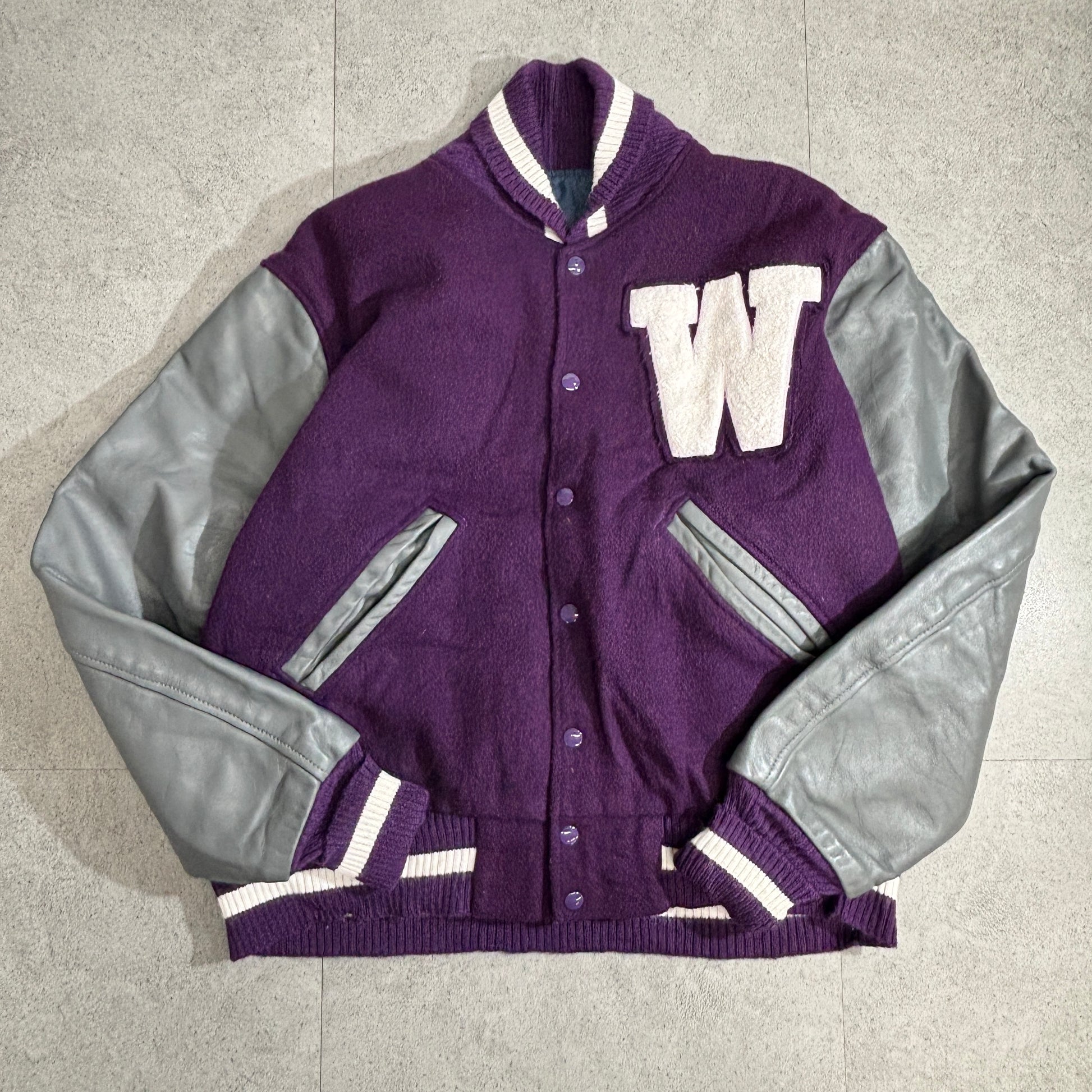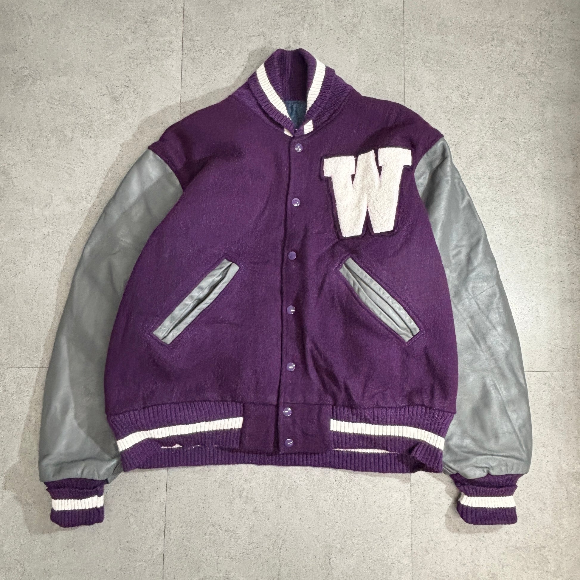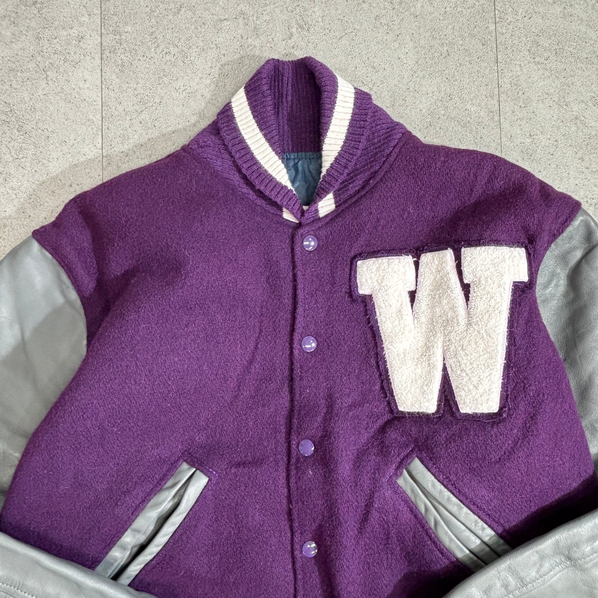 アメリカ・ユタ州のチームウエアメーカー“COLEMAN(コールマン)”のレターマン。ボディは深いパープルのウール、袖はグレーのレザーという王道配色。胸のビッグ“W”チェニール、ライン入りリブ、キルティング裏地まで当時らしい重厚な作りです。トレンドのワイドデニムやチノに羽織るだけで即主役。色落ちデニム&スニーカーでストリート、スラックスでクリーンにも。古き良きUSカレッジの空気感をそのまま楽しめる1着です。