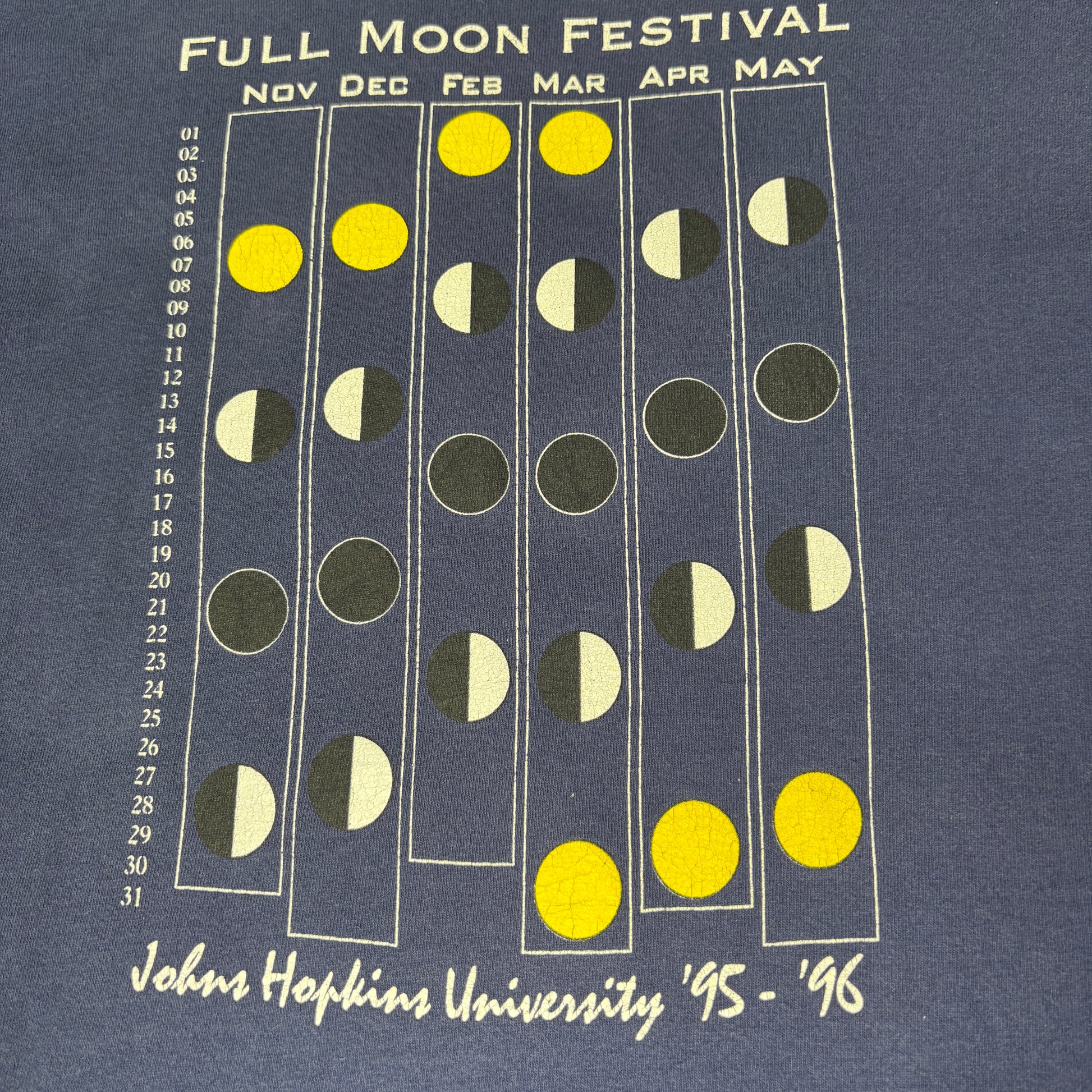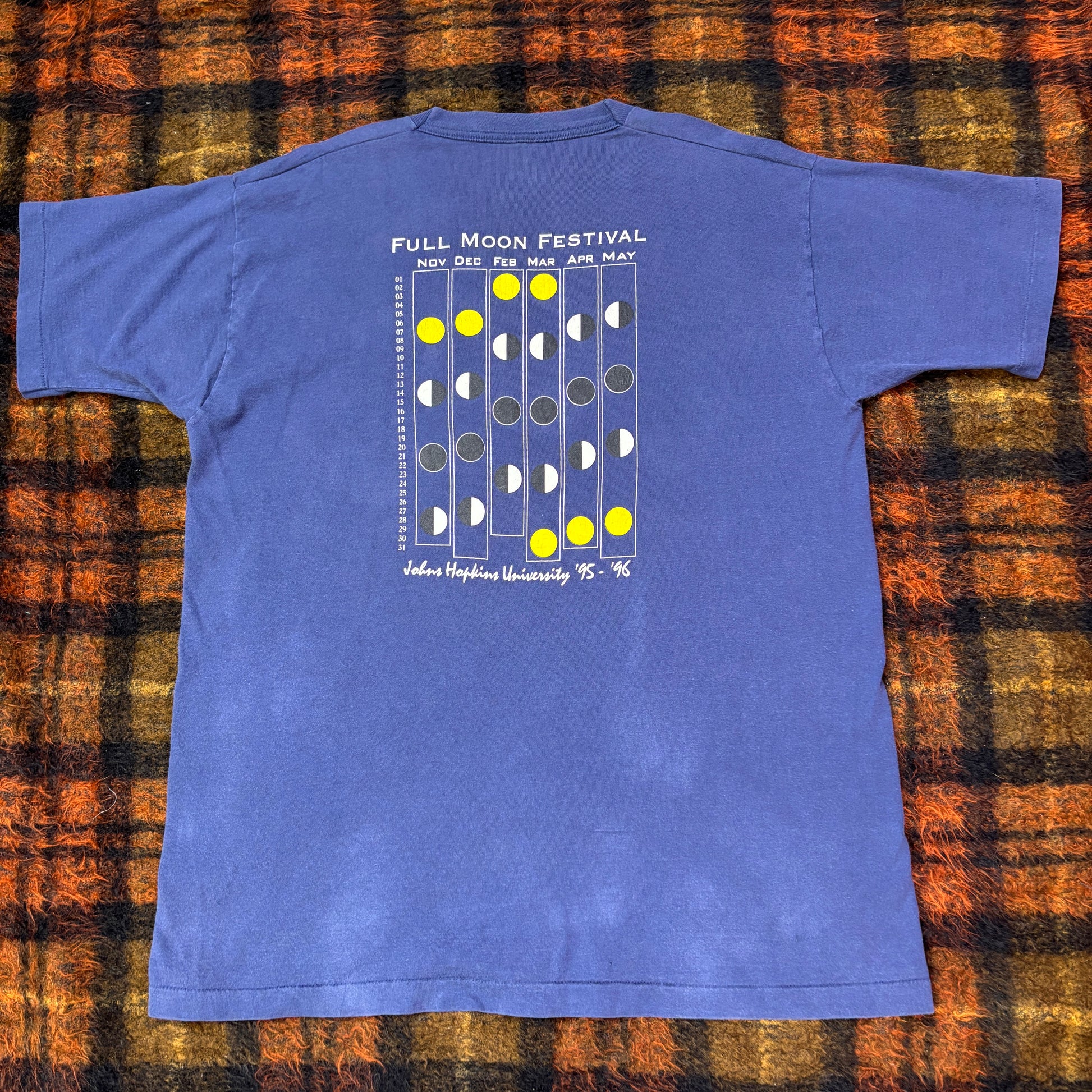 90s Johns Hopkins University “Full Moon Festival” ヴィンテージTシャツ – 月齢カレンダー/両面プリント – Made in USA XL