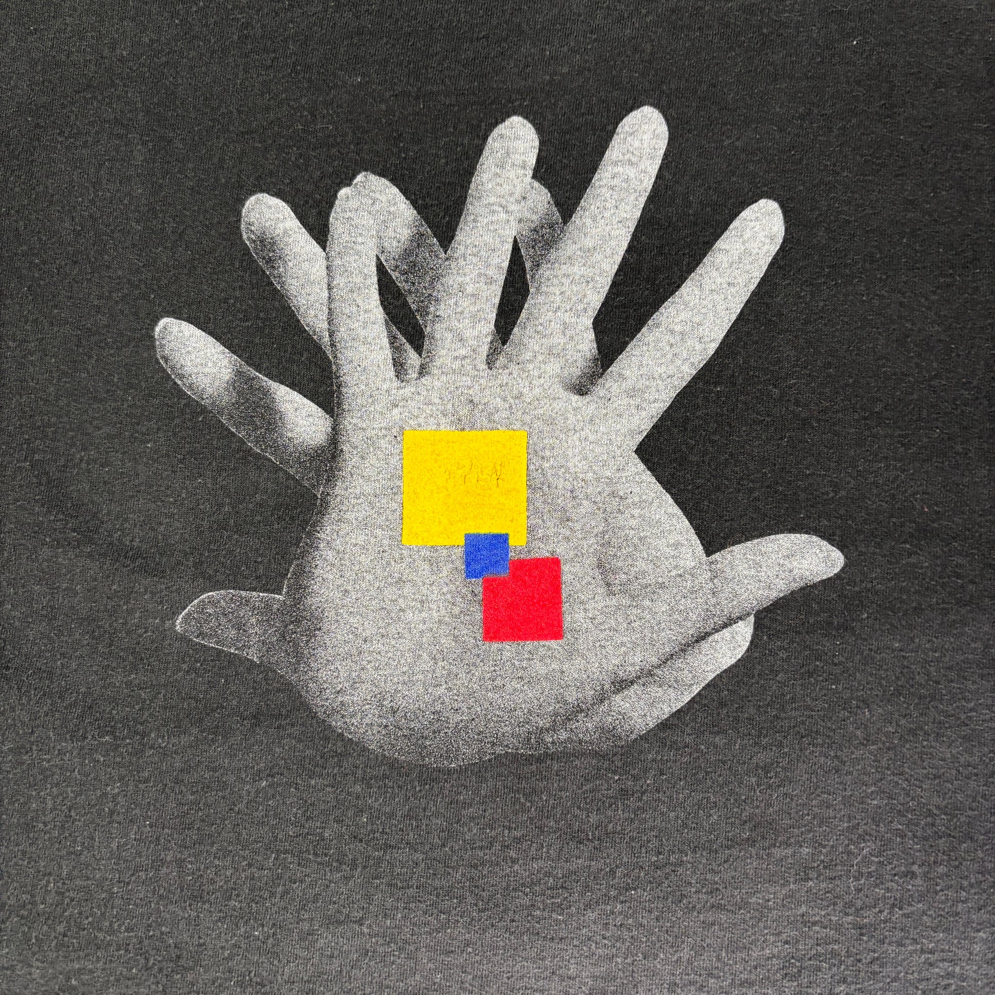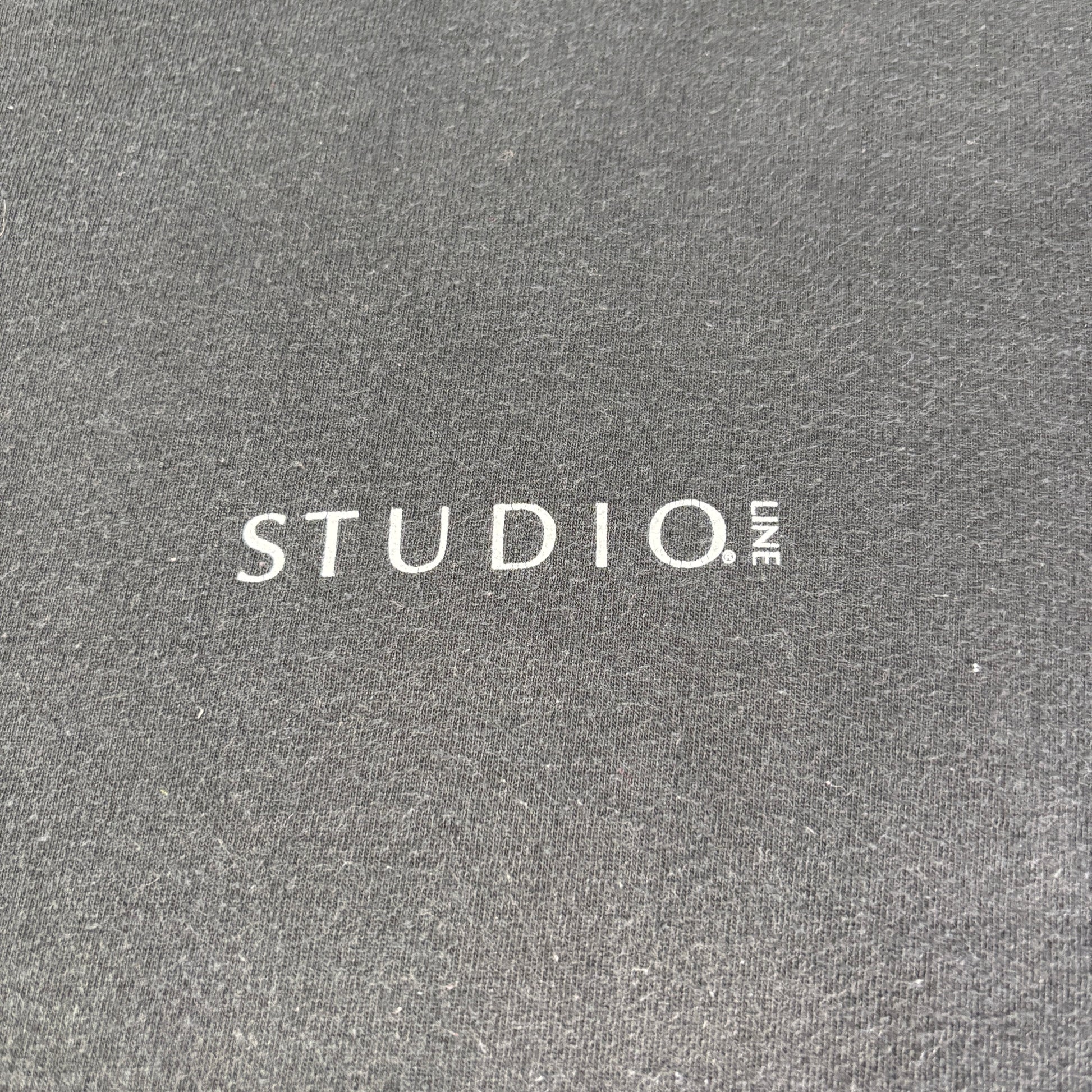 前面にはシンプルに「STUDIO LINE」のロゴ、背面には多重の手と幾何学モチーフが組み合わさった不思議なグラフィック。90年代特有のサブカルチャーやアートイベントの匂いを感じる、通好みな1着です。