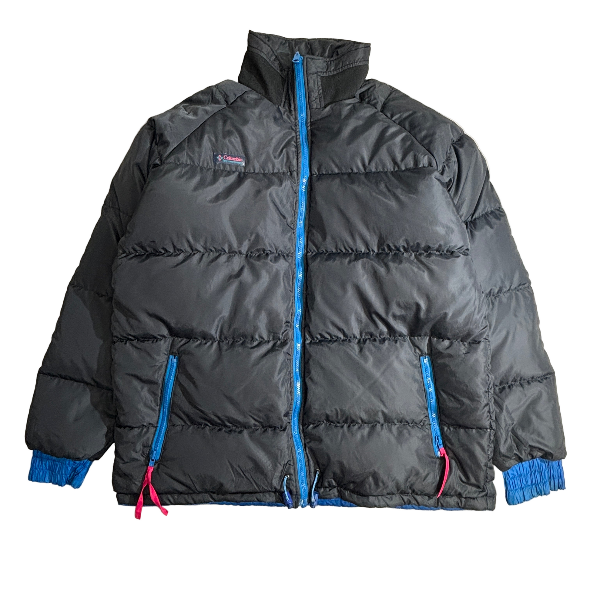 【おすすめ】1着で“アウトドア顔”と“パファー顔”の2スタイル。軽量ダウンで暖かく、街〜キャンプまで万能。90s〜00sのオールド・コロンビアらしい配色と青ジップが効いた一本です。