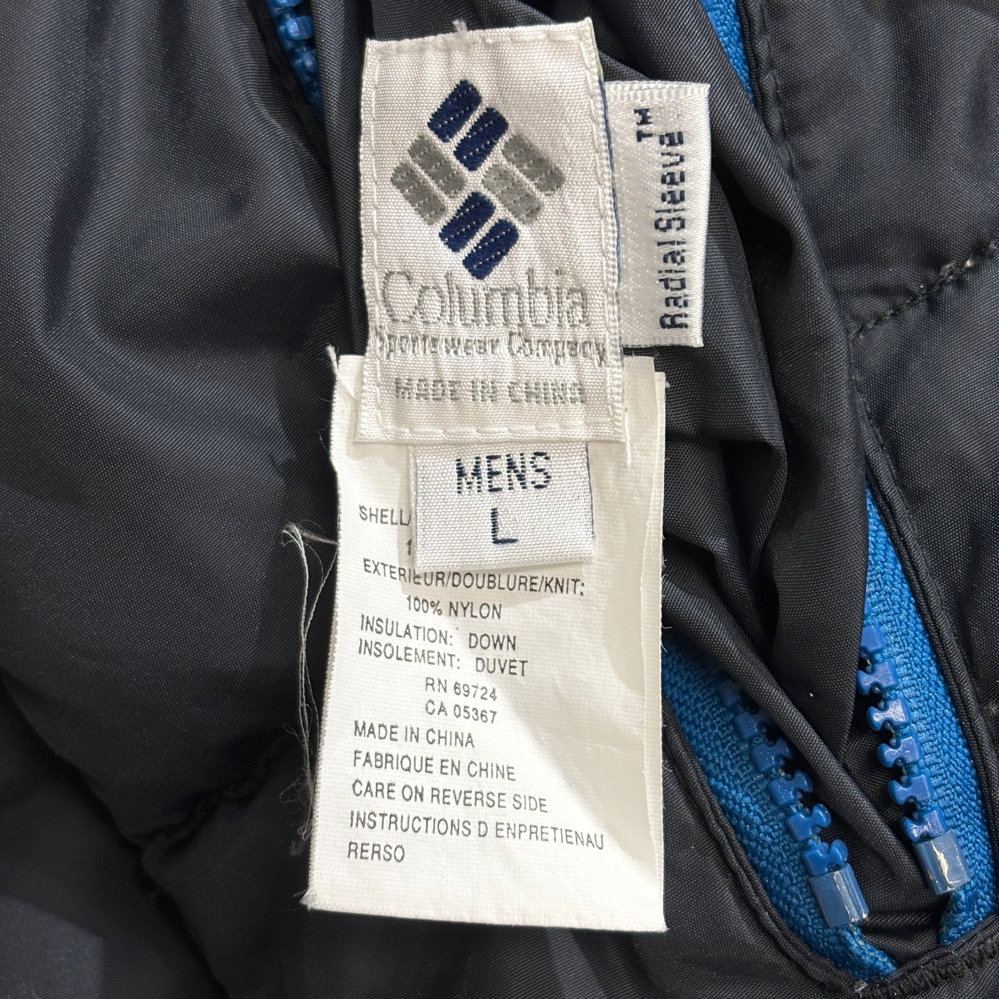 【アイテム詳細】ブランド:Columbia Sportswear Company/モデル:リバーシブル ダウンジャケット(Radial Sleeve™)/サイズ表記:MEN’S L/推定年代:90s後期〜00s前半タグ期/カラー:ブルー×ブラック(リバーシブル:片面パファー、片面ナイロン切替)/素材:表裏ともにナイロン100%、中綿:ダウン/生産国:CHINA/仕様:両A面で着られるリバーシブル、スタンドカラー、ジップ+ハンドポケット、ドローコード裾、発色の良いブルー×ブラックの切替デザイン/状態:古着らしい軽いアタリ・小スレあり(写真参照)が雰囲気良好で実用◎/真贋:タグ・縫製・各ディテールからオリジナルと判断しています。